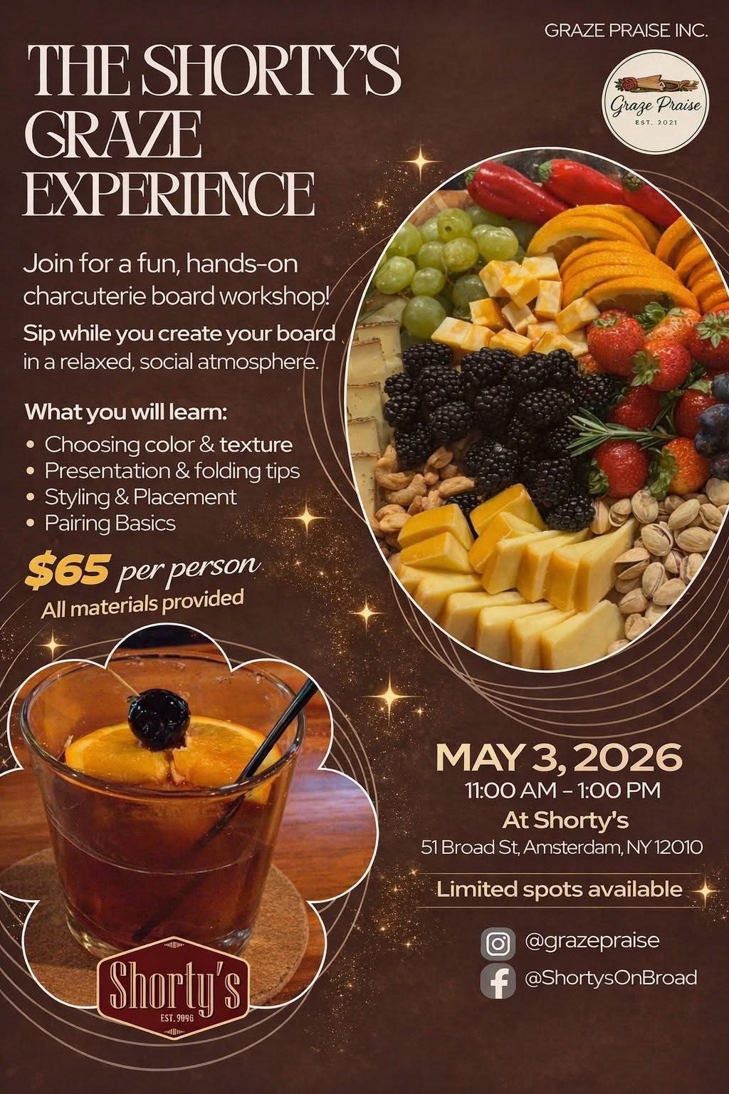 « All EventsCharcuterie Board WorkshopMay 3 @ 11:00 am - 2:00 pm« Plant Bingo at The NookAmsterdam Spring Fling Festival »We are doing a charcuterie board workshop May 3rd at 11:00 a.m.! Add to calendar Google Calendar iCalendar Outlook 365 Outlook Live Details Date: May 3 Time: 11:00 am - 2:00 pm Website: https://www.facebook.com/events/1688860388772745?active_tab=about Venue Shortys 51 Broad Street Amsterdam, New York 12010 + Google Map
