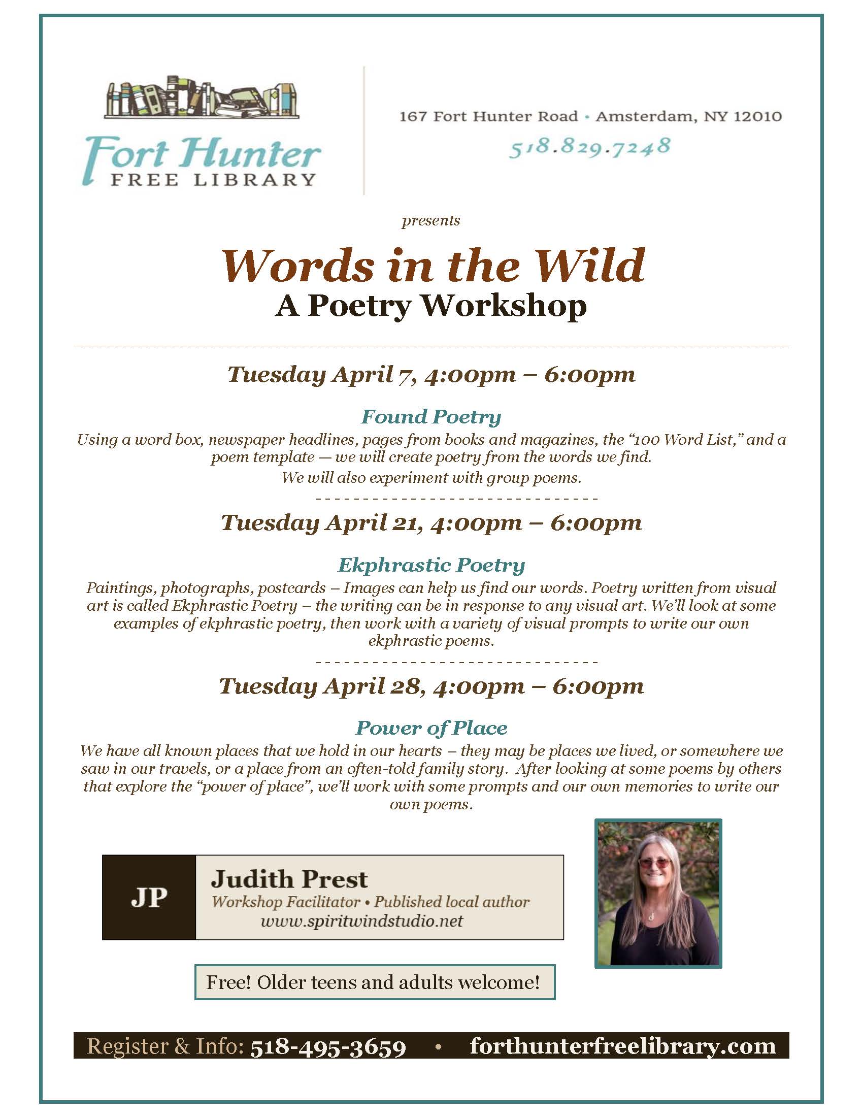 Join us at the Fort Hunter Free Library for a 3-session poetry workshop in April with local author Judith Prest!