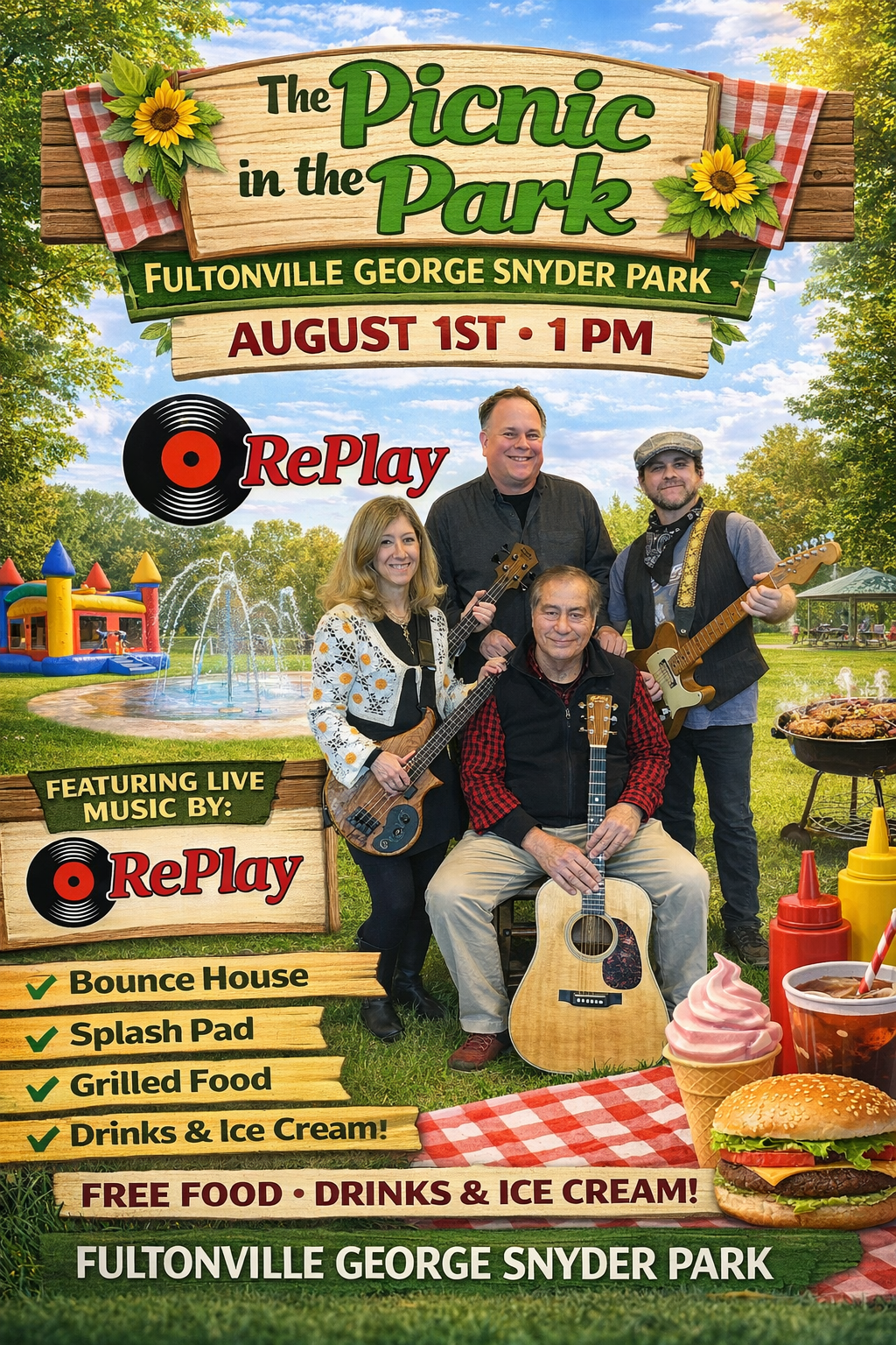 Fultonville George Snyder Park 31 Union Street, Fultonville, NY, United StatesCome out on Saturday August 1st for the annual picnic in the park. There will be music, a bounce house, splash pad, food, drinks and ice cream. Everything is free!!